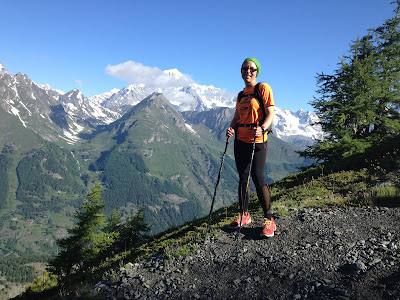 Iniziamo subito in salita, la carrareccia larga con i tornanti a quest'ora è in ombra e così si sale che è un piacere il tratto nel bosco, quindi sbuchiamo nei prati, per poi tornare di nuovo sotto maestosi abeti, questa volta seguendo un single track. L'ultimo tratto di salita è ghiaioso ed esposto, il terreno è scuro, color antracite; il sole ormai è sorto da dietro il colle sul quale stiamo salendo ed è radente, accecante. 1000 metri di salita che non molla un attimo in 8 km, uso i bastoncini per alleggerire il carico su quadricipiti e polpacci: la soddisfazione arrivata su è indescrivibile! Abbiamo conquistato un posto sulla terrazza panoramica davanti al Monte Bianco, c'è un silenzio e una luce surreali, la fatica avvolge il momento col gusto della conquista... un istante di magia!