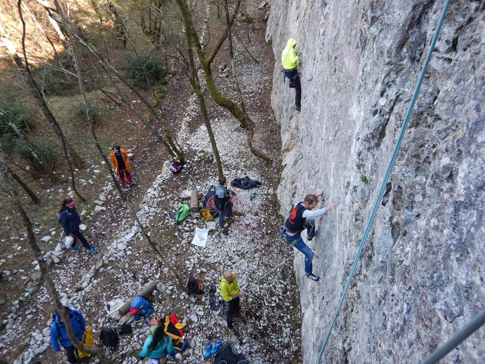 Quando arriviamo intorno alle 11, siamo Paolo, Patrizia, Loredana, Vincenzo Camilla, Clelia, Sandra (doppio festeggiamento per lei oggi!) Francesco e Deborah: proviamo a scaldarci ma la difficoltà, in aggiunta al grado, è data dalla roccia gelida, che congela le mani, se già non si fossero autonomamente assiderate! Poi arriva anche Anselmo con il figlio Sebastiano: che bello vedere un radazzo così giovane determinato e entusiasta.
